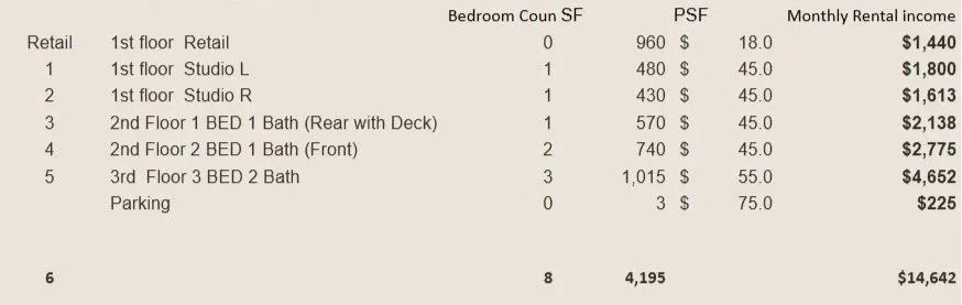 Strategic Layout: The upper floors are optimized for efficiency and comfort, with the 2nd and 3rd floors featuring a mix of front-facing 1-bedroom units and rear 2-bedroom/2-bathroom layouts.